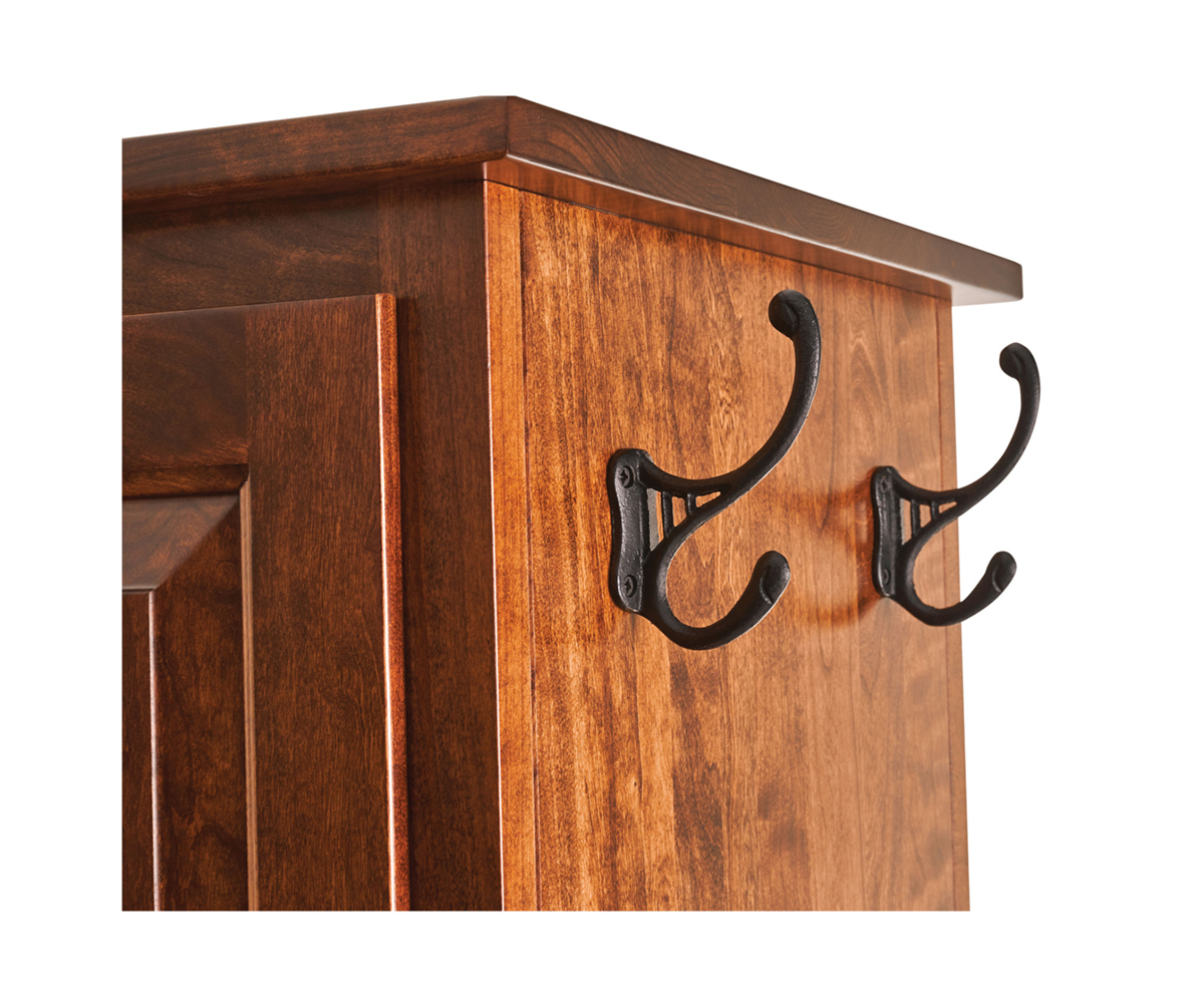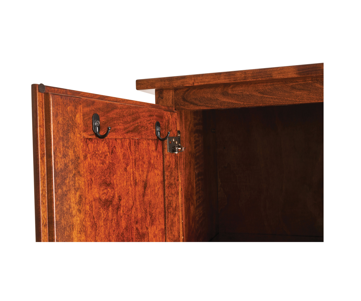 Features: • Mirror on one side • Door and drawers on the back • Small hooks behind door • Two wood shelves behind door • Dovetailed drawers below door • Full extension drawer slides • Large hooks on opposite sides